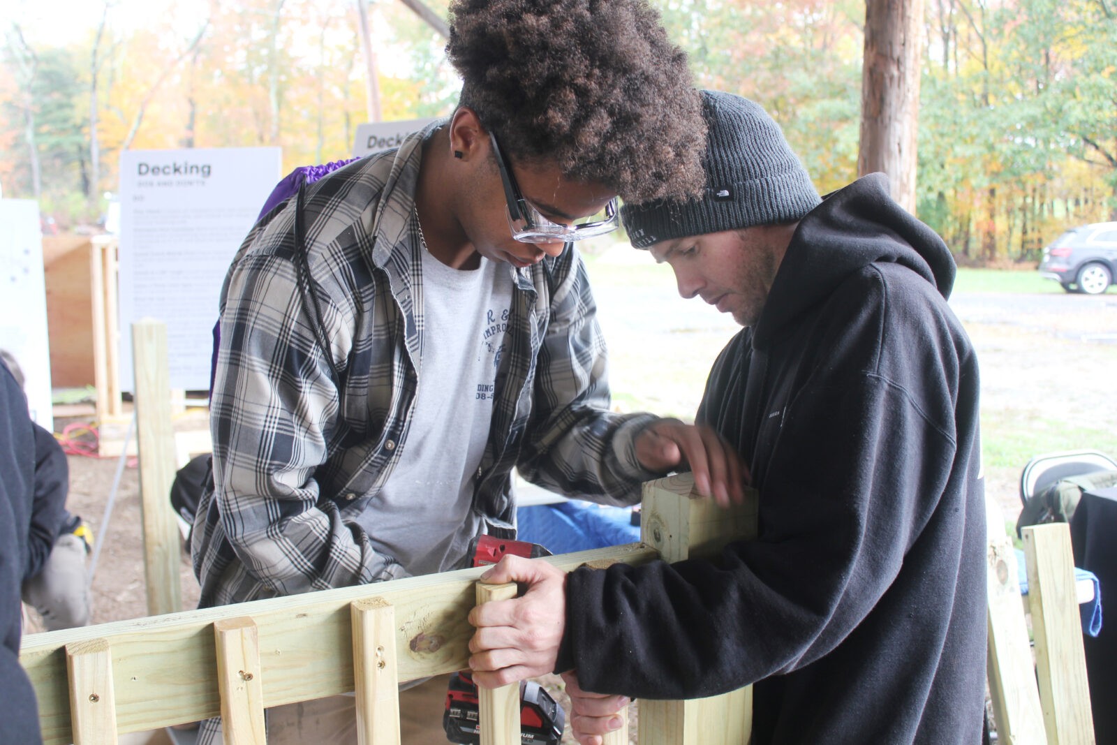 Our Jr. Sales + Estimator, Tyler, advises carpentry students on how to properly space decking and where to install the screws.