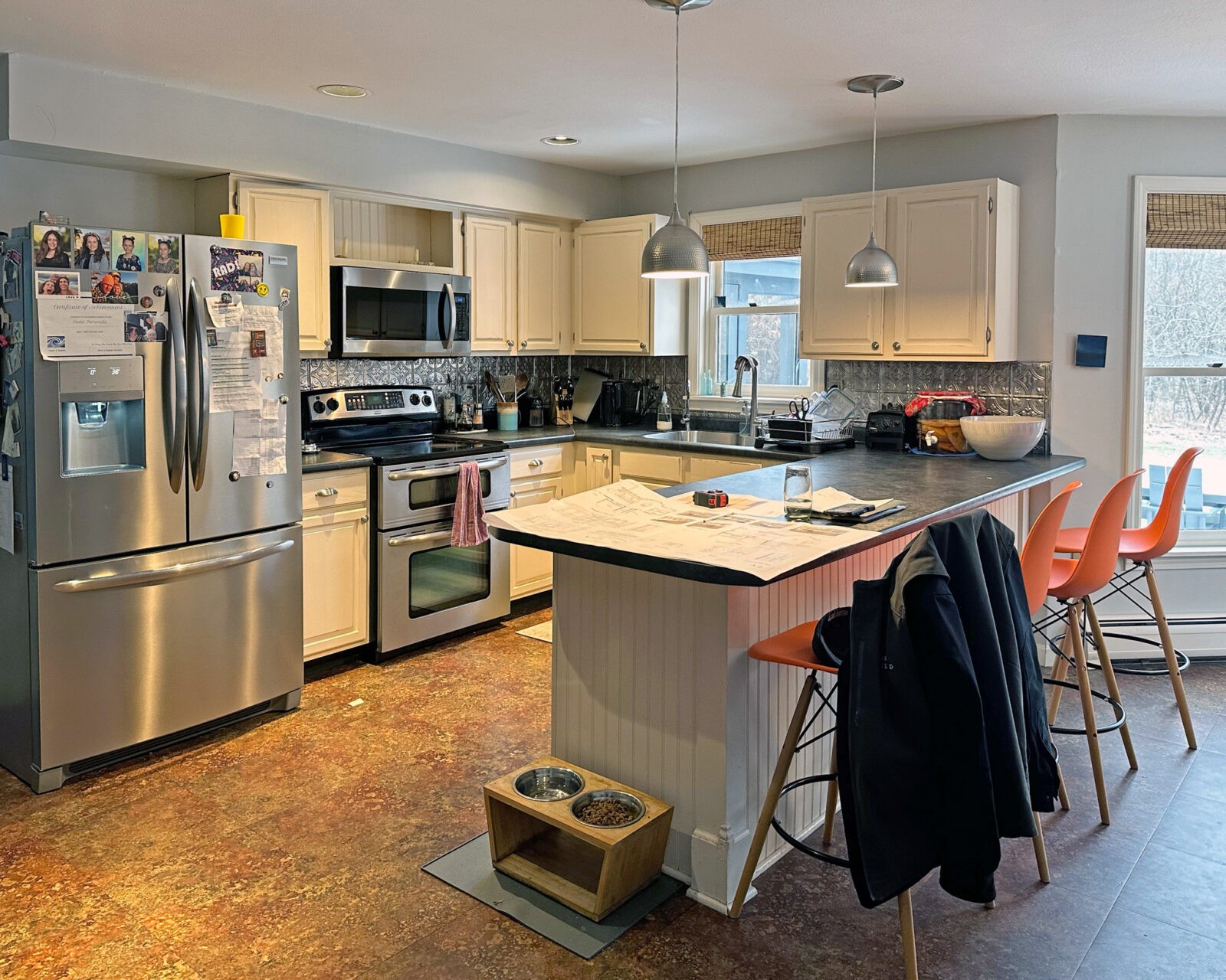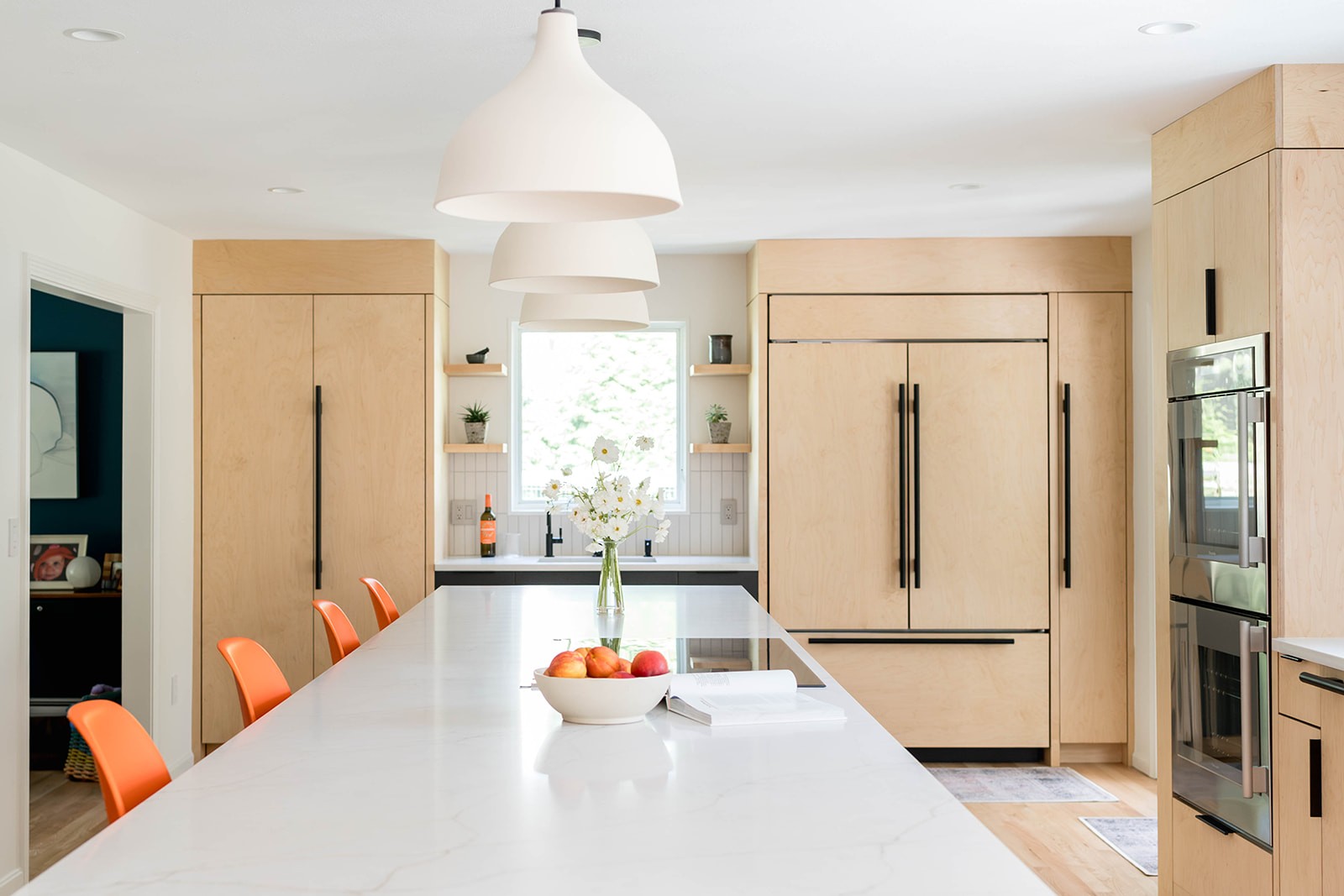 Our clients loved their home in the suburbs of New Hampshire, but for such a spacious house, their kitchen was cramped and outdated. They were looking for much more space to prep, cook, and enjoy with a cohesive design that matched their minimalist style. To create their dream kitchen, we incorporated the former dining room, installed modern plywood custom cabinetry from Boxco Studio, and added a 15-foot island as the room’s centerpiece.